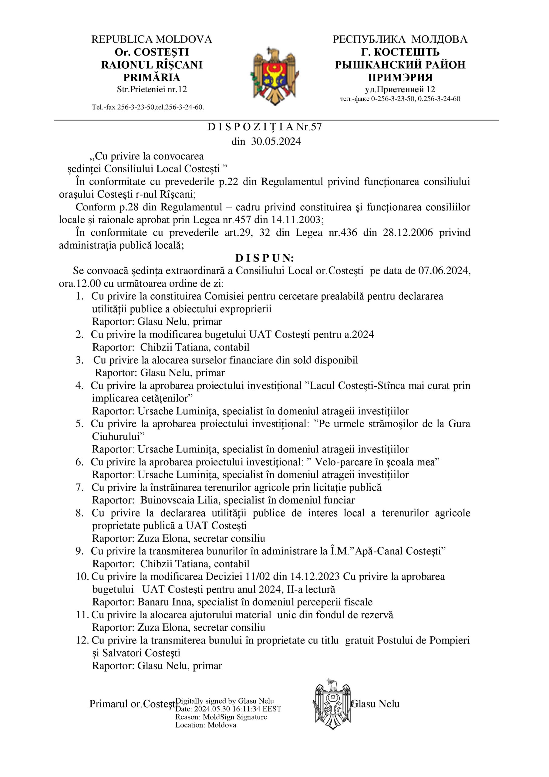 Cu privire la convocarea ședinței Consiliului Local Costești